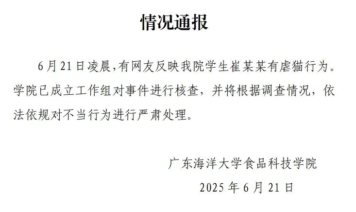 21日,广东海洋大学食品科技学院发布一则情况通报,全文如下: