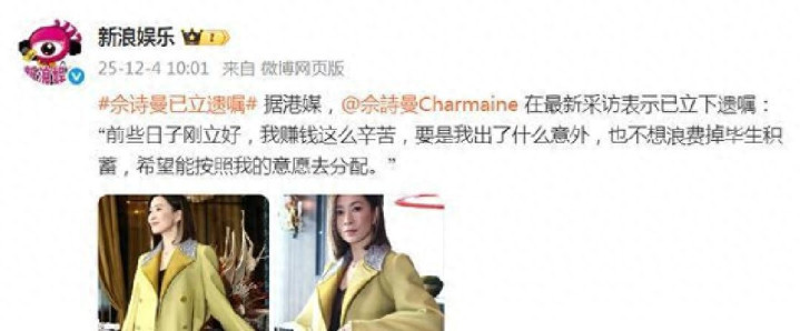 最近一次受访时,佘诗曼提到一件听上去有点“沉重”,却又特别清醒的事,她说自己前阵子刚把遗嘱立好,理由很简单,钱是这几年一点一点拼出来的,要是哪天突然出了意外,她不想辛苦存下来的积蓄就这样乱花掉,更希望能提前说明白,照着自己的意思去安排