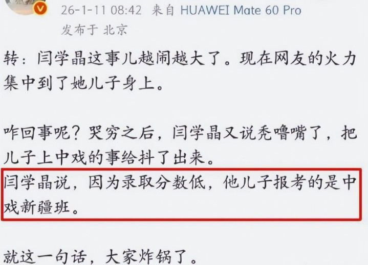 就在忘本的争议还没平息时,有网友质疑闫学晶的儿子是“高考走后门”上的中央戏剧学院。