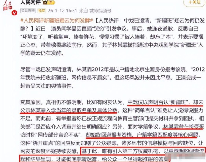 人民网表示,林傲霏没招收进新疆班应该拿出实际证据来,不能只说是不实信息。