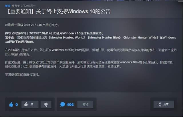 首先遭到玩家指责的重点对象,自然是到现在还有各种问题的《怪物猎人 荒野》。玩家们普遍认为,《怪物猎人 荒野》是本来就应该在win10下稳定运行的;现在因为微软停止win10支持,卡普空就决定放弃“荒野”是一种推卸责任的表现。