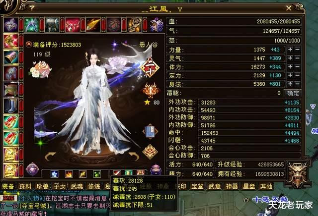 血量208万,蓝量12万,内功攻击5.4万,命中15.2万,闪避4.3万,会心攻击2106,会心防御706,主毒攻击28128,减毒抗2608!