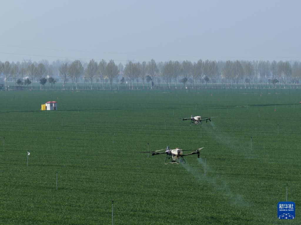 4月1日,飞防无人机在河南周口国家农高区小麦高产创建示范田作业(无人机照片)。新华社记者 李嘉南 摄
